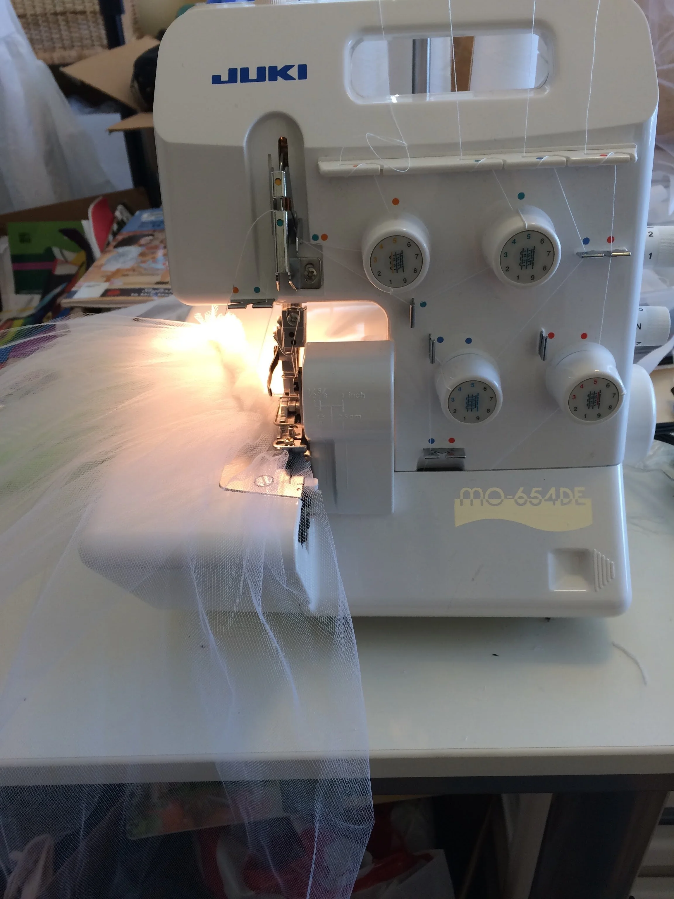 This was my first ambitious “high stakes” make, as it was for my daughter’s First Communion. I bought a beautiful Swiss cotton sateen which gave it a nice, soft sheen. It was underlined with cotton batiste. The lace was a delicate French lace that cost almost as much as the fabric. The whole thing is beastly to iron, so I’m glad she only wore it a few times. I made a matching dress for her doll for fun. I used my vintage Singer 201-2 and tried some of the old attachments for the first time, including the tucker and the buttonholer. I used the ruffler attachment for the top of the doll’s skirt instead of gathering, and it worked well. I joined modern times by using my Juki serger to tidy the raw edges of the dresses and do the rolled edge of her veil.